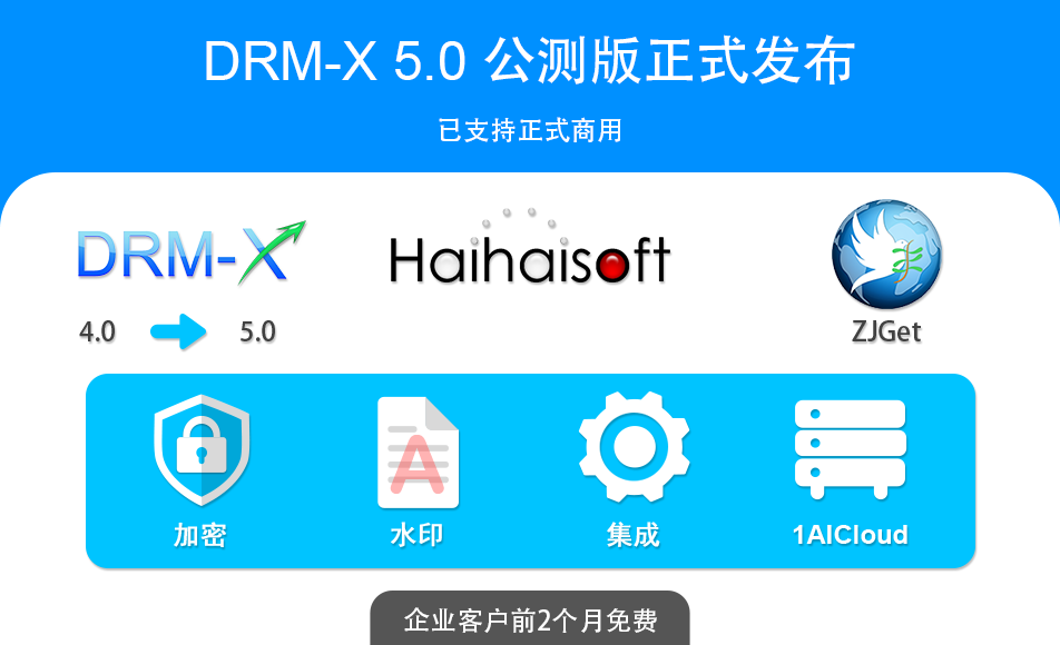 目前,DRM-X 5.0为公测版本。对于新客户,只要提交完整企业信息,经海海软件审核确认其为合法内容企业后,即可获赠2个月企业账号免费试用。
